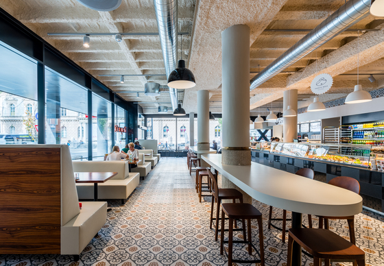 Der erste Schritt, den man in Köberls MPreis in der Maria-Theresien-Straße setzt, überrascht, denn er wirft alle gängigen und längst international angewandten Spielregeln der Supermarktarchitektur über Bord. An der Decke befindet sich dunkelblaues, fast schwarzes Glas. Und auf dem Boden liegen nicht etwa PVC oder Fliesen, sondern weiß geöltes Eichenparkett. „Aufgrund der niedrigen Raumhöhe von nur drei Metern mussten wir tricksen“, erklärt Köberl. „Das dunkle Glas an der Decke sorgt dafür, dass sich der gesamte Raum darin spiegelt und der Supermarkt doppelt so hoch erscheint, wie er tatsächlich ist. Und Parkettboden? Warum auch nicht? Das Holz schafft eine Atmosphäre des Wohlfühlens.“