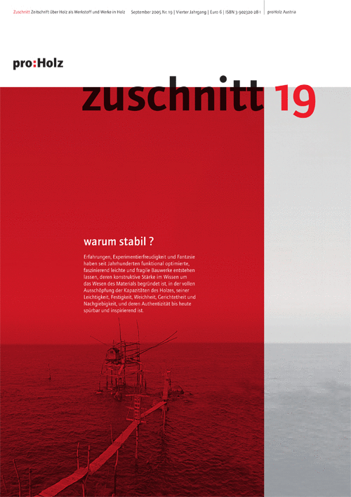 »Konstruieren, nicht rechnen!« lautet Karlheinz Wagners Postulat in seinem Beitrag »Fragil bauen« und damit fasst er mit drei Wörtern zusammen, worum es in diesem Zuschnitt geht: um Beispiele von Holzarchitektur, bei deren Entstehung jahrelange Erfahrung, Experimentierfreudigkeit, viele Versuche, auch