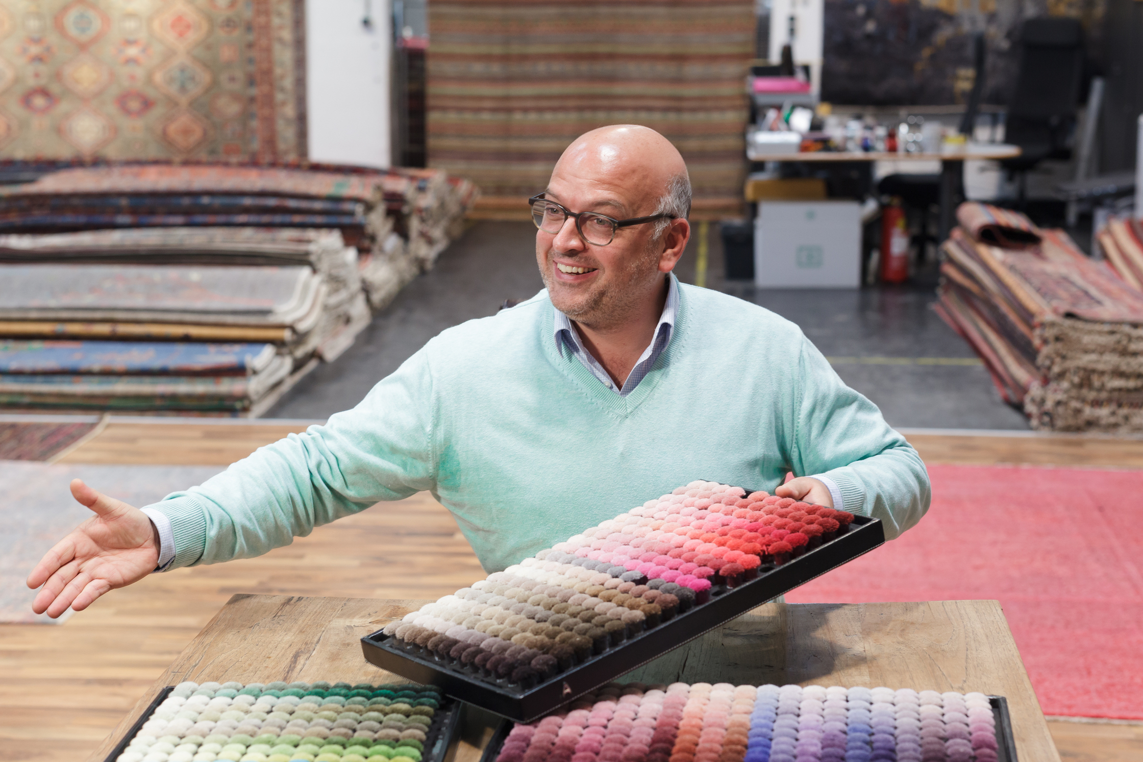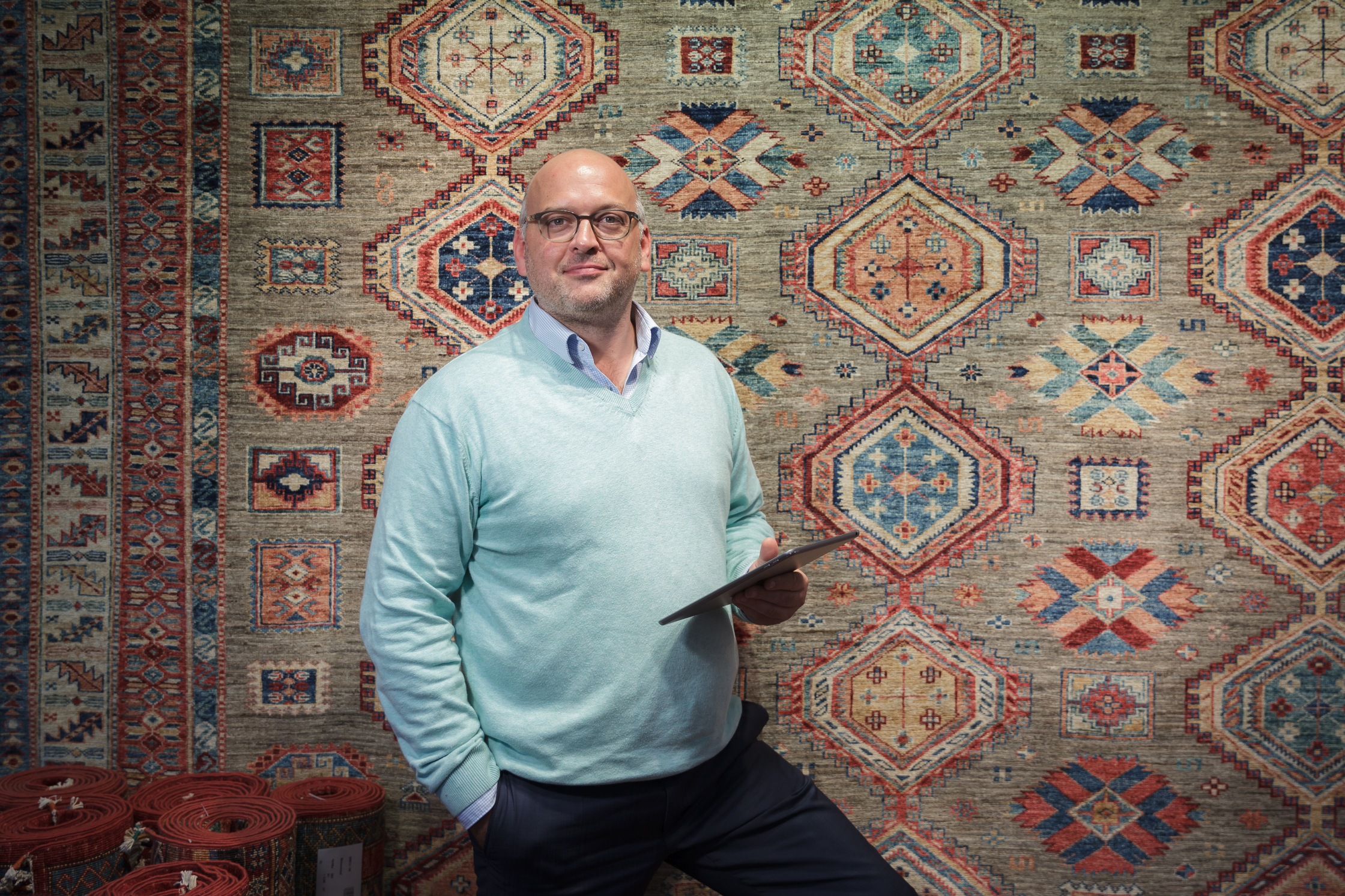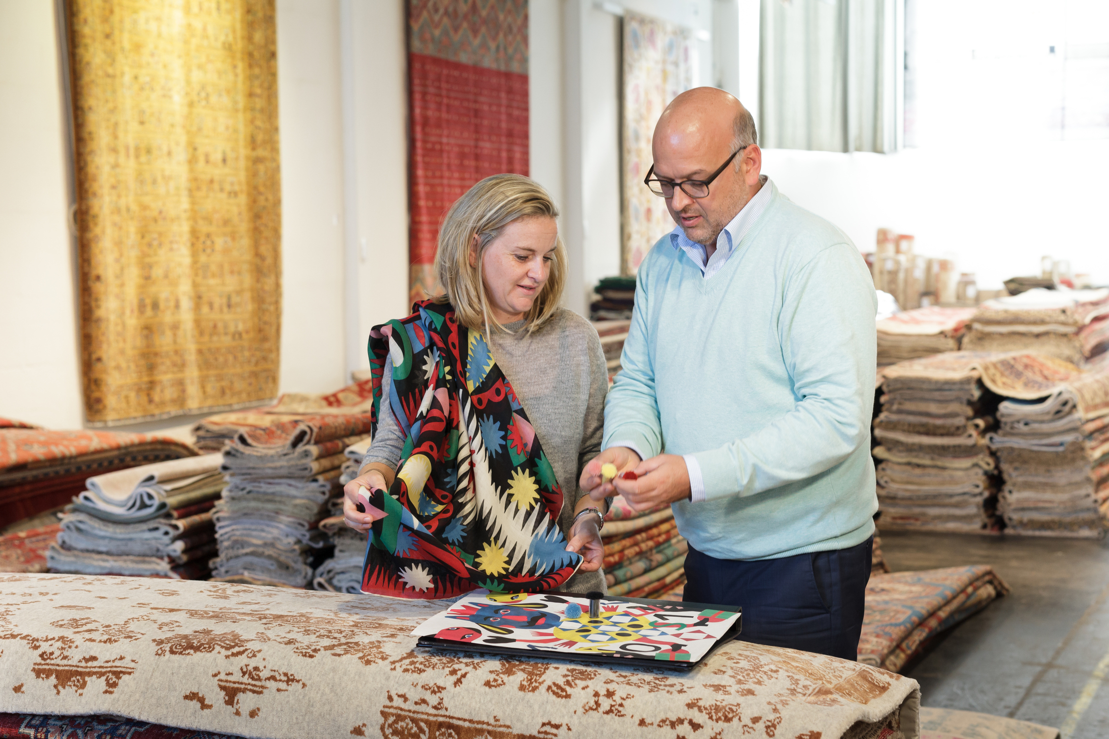 Teppichstapel auf dem Boden, weitere Prachtstücke hängen an der Wand. Es ist bloß die riesige Lagerhalle eines Großhändlers und doch kann man sich dem besonderen Charme nicht entziehen. Jedes Stück erzählt eine Geschichte, erzählt von Tradition, Begegnung, Zeit und Natur, erzählt vom alten Wissen um eine hohe Kunst. Wenn Christoph Ziereis sagt, er sei Teppichhändler, wird er oft belächelt. Ein altmodischer Beruf? Nein, so wie er es betreibt, ist es ein vielschichtiger und sehr abwechslungsreicher! Dabei ist Christoph Ziereis Quereinsteiger und kommt vom Werbefilm. Sein Schwiegervater, Fritz Langauer, der sich im Jahr 2000 von der Detailhandelsfirma Adil Besim getrennt hatte, verlegte die seit 1973 in Zürich bestehende Oritop nach Wien. Überraschenderweise begann die Nachfrage der großen Möbelhäuser zu boomen, und so folgte nicht nur Christoph Ziereis dem Ruf ins Familienunternehmen, sondern auch seine Ehefrau Julia. „In unserem männerdominierten zehnköpfigen Team sind ihre weiblichen Sichtweisen und Kreativität sehr wertvoll!“, bekräftigt der Geschäftsführer.