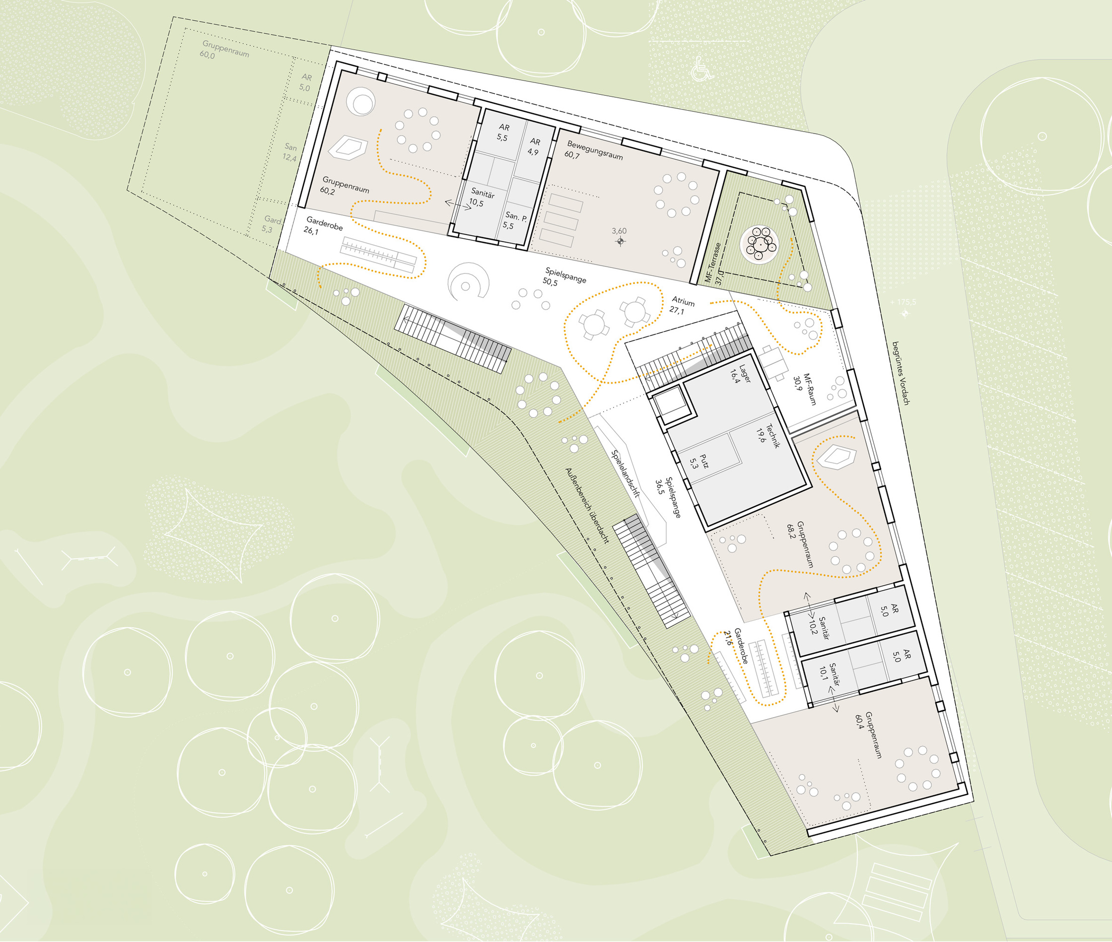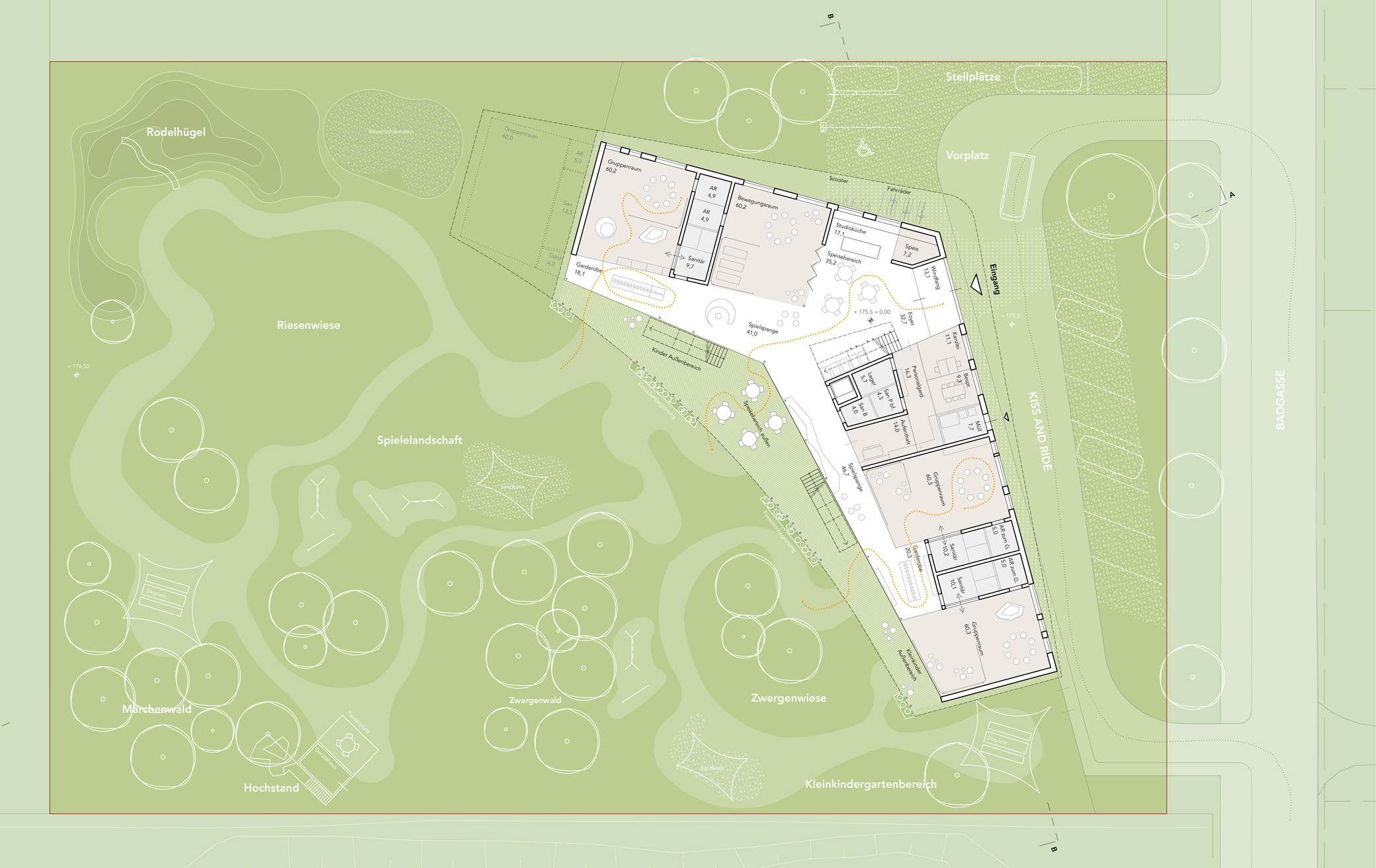 Es wurden detaillierte Ausarbeitungen und Vorschläge zur gegenständlichen Bauaufgabe sowohl in städtebaulicher / baukünstlerischer, als auch in funktionaler / ökonomischer Hinsicht erwartet, um einen (klein)kindgemäßen Entwicklungs-, Spiel-, Forschungs- und Lernraum einerseits und einen geeigneten Arbeitsplatz für die Pädagog:innen und das Betreuungspersonal andererseits zu schaffen.