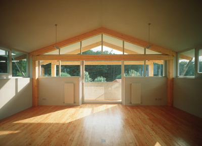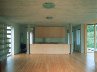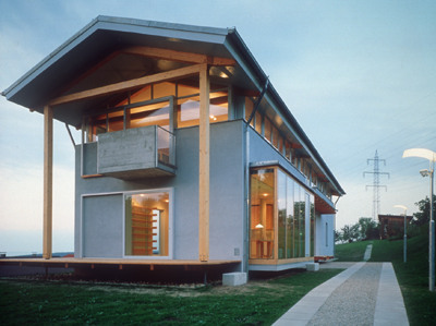 Man sieht, wie bei nach Klarheit strebenden Konzepten Nebensächlichkeiten rasch störend wirken können. Die Stützen sind – natürlich nur optisch – auf der kragenden Platte aus Balken und Brettern aufgestützt, die das Haus an drei Seiten umgibt. Mit dieser floßartigen Platte wird die Beziehung zum Boden verschattet, und man könnte durchaus das Bild eines sanft gestrandeten Hausfloßes assoziieren. Das Haus als Familienschiff, als Arche, die mit dem Hang nur über jenes fast zufällige Aufsitzen – wie nach einer Flut – in Verbindung tritt. In diesem „Anlegen“ ist auch das Vorübergehende enthalten, das sich im Haus selbst widerspiegelt, indem es prinzipiell demontierbar und wiederverwertbar ist.