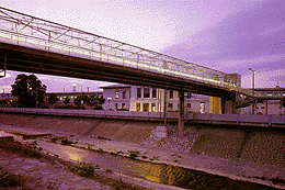 Annähernd brückenlange Horizontalschlitze, die die Dynamik des Radfahrens unterstreichen, geben den Blick frei auf die idyllische Flusslandschaft.