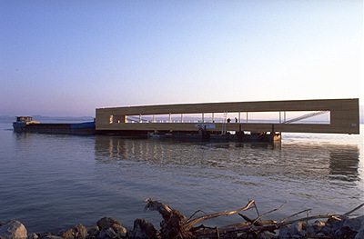 Die Brücke wurde in Hard am Rheindamm zusammengebaut, auf einen Ponton verladen und über den Bodensee zum Alten Rhein geschifft, wo sie mittels Telekränen auf die Widerlager gesetzt wurde. Die Bauzeit betrug 2 Wochen. Die Radfahrbrücke Gaißau bietet ein Raumerlebnis, das an die alten Holzbrücken im Film »The bridges of Madison County«, USA, in der Regie von Clint Eastwood erinnert. Die Brücke als Zwischenwelt, als FlussRAUM. Hermann Kaufmanns Brücke macht das Queren bewusst, ohne hermetisch zu sein.