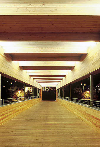 Die Träger sind beidseitig lärchenverschalt und damit witterungsbeständig. Der Bodenbelag besteht aus robusten gerillten Eichenbohlen. Chemischer Holzschutz wurde nicht angewendet.