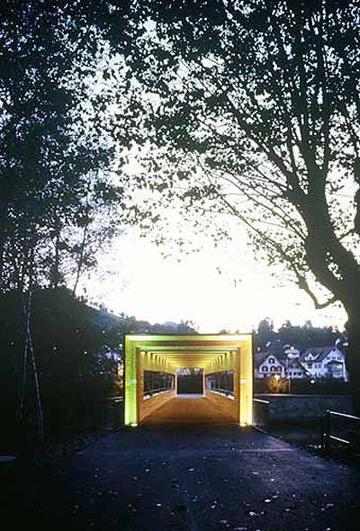 Je zwei massige Träger, die die Seitenwände bilden, dominieren die Brücke über den Alten Rhein. Sein Schweizer Ufer liegt etwas tiefer als das österreichische, was Kaufmann zu einem Konzept mit formaler Brisanz nützt. Indem er das Dach horizontal führt, ergibt sich ein konischer Längsschnitt. Zugleich legt er aber die geneigte Fahrbahn, also den Grundriss dazu gegenläufig konisch an. Das ergibt beim österreichischen Ufer ein quadratisches Portal, auf der schweizer Seite ein hochgestelltes Rechteck.