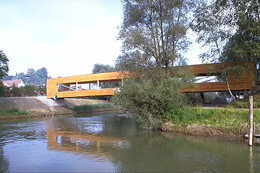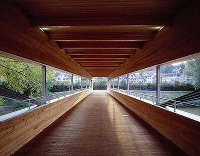 Die zwei Hauptträger der Seitenwände mit dazwischenliegendem Zugband aus Stahl bilden ein unterspanntes Tragwerk. Sie bestehen aus jeweils zwei Leimbindern in der Höhe des Daches und über der Fahrbahn und dem parabelförmigen Zugband, das aus vier Flachstählen besteht, die jeweils an den Brückenenden sichtbar sind. Der Horizontalverband unter der Fahrbahn besteht aus Stahl. Das Dach aus einer einfachen Balkenlage, auf die eine 40mm starke Dreischichtplatte genagelt ist, gewährleistet zugleich die Stabilität des Obergurtes. Zwischenstützen über die gesamte Brückenlänge tragen das Dach.