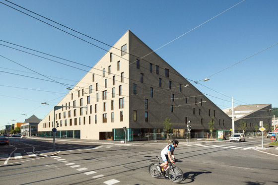 Genau das ist Georg Driendl mit seinem „Twist Tower“ gelungen. Der Name spielt einerseits auf die „Twin Towers“ am Wienerberg an - eine mutige Analogie, da der Twist leicht 20mal in den Twin Towers Platz fände und von einem Tower überhaupt nur dann die Rede sein kann, wenn man sich die umgebende Bebauung wegdenkt - und andererseits auf eine Eigenart des Grundrisses: Die annähernd quadratischen Geschoß- ebenen des Hauptgebäudes sind jeweils um wenige Grad gegeneinander verschwenkt, was sich in den Fassaden deutlich abzeichnet: So wie sich an den Häusern nebenan Erker in den Straßenraum vorschieben, sind hier ganze Fassadenflächen gegeneinander verschwenkt und geben dem Gebäude seine charakteristische Erscheinung.