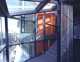 Noch in einem weiteren Punkt unterscheidet sich der Twist Tower von seinen Nachbarn. Statt Treppe und Aufzug im Inneren des Gebäudes zu verbergen, läßt Driendl sie an der Fassade zur Schönbrunner Straße sichtbar werden. Dahinter steht die Idee, den Straßenraum zu beleben und die vertikale Erschließung zur halböffentlichen Verlängerung des Gehsteigs zu machen. In seinen ersten Entwürfen wollte Driendl die Öffnung zu dem dahinter liegenden begrünten Hofraum noch deutlicher betonen. Immerhin gibt es jetzt einen schmalen zwei-geschoßigen Durchblick, der Tiefe erahnen läßt.