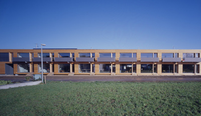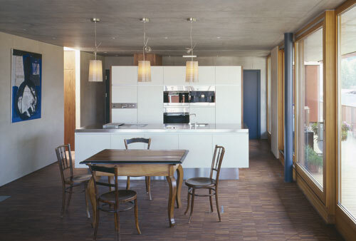 luftbeheiztes Passivhausreihenhäuser mit dezentraler Lüftungsanlage; Restwärmebedarf wird über zentrale Pelletskesselanlage gedeckt; Warmwasserbereitung mit Solaranlage; 3-Scheibenverglasung in Vollholzfensterrahmen (U-Wert Glas: 0,6 W/m2K, U-Wert Glas+Rahmen: 0,8 W/m2K, g-Wert: 53%)