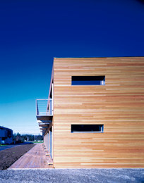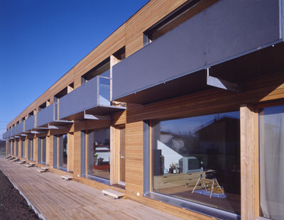luftbeheiztes Passivhausreihenhäuser mit dezentraler Lüftungsanlage; Restwärmebedarf wird über zentrale Pelletskesselanlage gedeckt; Warmwasserbereitung mit Solaranlage; 3-Scheibenverglasung in Vollholzfensterrahmen (U-Wert Glas: 0,6 W/m2K, U-Wert Glas+Rahmen: 0,8 W/m2K, g-Wert: 53%)