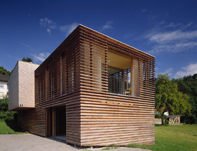 Nun also ein weiteres Haus an demselben Ort nach einer ganzen Reihe von Häusern, die auf das Unterland und den Bregenzerwald verteilt sind. Seine äußerste Fassadenschicht besteht aus zahlreichen, extrem feinen, horizontal befestigten Leisten, die mattenartig unter dem knappen Dachüberstand herabzuhängen scheinen. Damit wird jeglicher Eindruck von Masse sublimiert; und auch das Holzige, wie es manchen Lamellenfassaden oder vertikalen Verbretterungen anhaftet, wird neutralisiert.