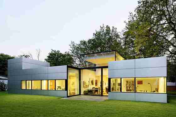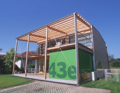 Westlich davor steht nun seit kurzem ein kleines Haus mit Holzfassade und Satteldach. Sein primäres Volumen besteht aus einem länglichen Quader. Das Dach weist eine Neigung von nur 20 Grad auf, der daher wenig betonte First verläuft in Längsrichtung.