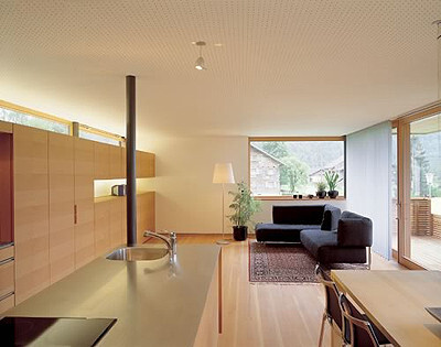 Aber aus dem Volumen sind größere Teile ausgeschnitten: da eine Ecke, dort ein Prisma über die gesamte Länge. Und die verglasten Öffnungen bilden meist Fortsetzungen der Ausschnitte oder schließen diese als zurückgesetzte Trennebene klimatisch ab. Ins Auge fällt jedoch die äußere Hülle, deren Feingliedrigkeit ins Textile changiert. - Nun möchten wir natürlich wissen, wer das Bauwerk entworfen hat. Es ist dies Helmut Dietrich, geboren in Mellau, zwei Dörfer unterhalb Schnepfau, der zusammen mit Much Untertrifaller in Bregenz ein Architekturbüro führt. Von den beiden stammen die spektakuläre Erweiterung des Bregenzer Festspielhauses, einige Wohnanlagen, mehrere Kindergärten und zahlreiche Ein- und Zweifamilienhäuser. Von Dietrich sind auch feinsinnige Möbelentwürfe und Innenraumgestaltungen bekannt.