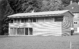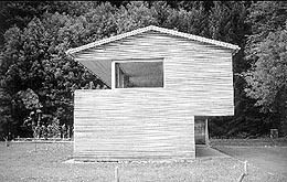 Westlich davor steht nun seit kurzem ein kleines Haus mit Holzfassade und Satteldach. Sein primäres Volumen besteht aus einem länglichen Quader. Das Dach weist eine Neigung von nur 20 Grad auf, der daher wenig betonte First verläuft in Längsrichtung.