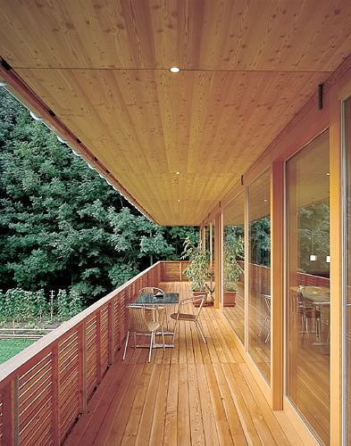 Aber aus dem Volumen sind größere Teile ausgeschnitten: da eine Ecke, dort ein Prisma über die gesamte Länge. Und die verglasten Öffnungen bilden meist Fortsetzungen der Ausschnitte oder schließen diese als zurückgesetzte Trennebene klimatisch ab. Ins Auge fällt jedoch die äußere Hülle, deren Feingliedrigkeit ins Textile changiert. - Nun möchten wir natürlich wissen, wer das Bauwerk entworfen hat. Es ist dies Helmut Dietrich, geboren in Mellau, zwei Dörfer unterhalb Schnepfau, der zusammen mit Much Untertrifaller in Bregenz ein Architekturbüro führt. Von den beiden stammen die spektakuläre Erweiterung des Bregenzer Festspielhauses, einige Wohnanlagen, mehrere Kindergärten und zahlreiche Ein- und Zweifamilienhäuser. Von Dietrich sind auch feinsinnige Möbelentwürfe und Innenraumgestaltungen bekannt.