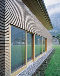 Nun also ein weiteres Haus an demselben Ort nach einer ganzen Reihe von Häusern, die auf das Unterland und den Bregenzerwald verteilt sind. Seine äußerste Fassadenschicht besteht aus zahlreichen, extrem feinen, horizontal befestigten Leisten, die mattenartig unter dem knappen Dachüberstand herabzuhängen scheinen. Damit wird jeglicher Eindruck von Masse sublimiert; und auch das Holzige, wie es manchen Lamellenfassaden oder vertikalen Verbretterungen anhaftet, wird neutralisiert.
