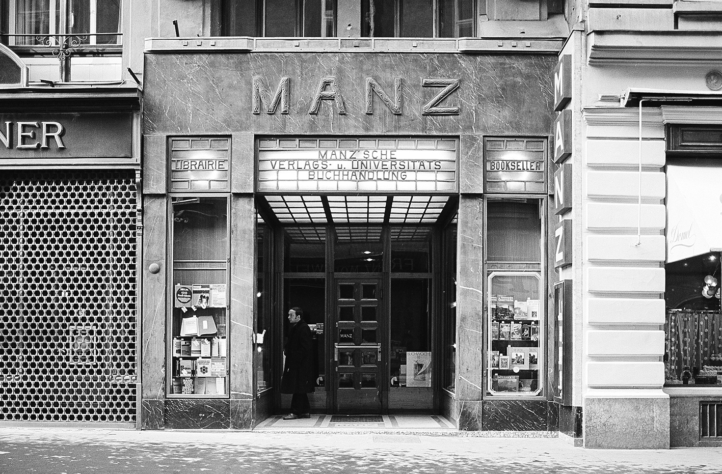 Wer über den Wiener Kohlmarkt geht, kommt bei der Nummer 16 zur Buchhandlung Manz, gelegen zwischen einem Juwelier mit klingendem Namen und dem weltbekannten Hofzuckerbäcker Demel. Eigentlich verweist nur der vergoldete Firmenschriftzug eindeutig auf die Zeit der Entstehung, ansonsten fügt sich das 1912 von Adolf Loos (1870-1933) erbaute Portal in seiner zeitlosen Eleganz scheinbar nahtlos in die Architektur der „Luxusmeile“ ein.