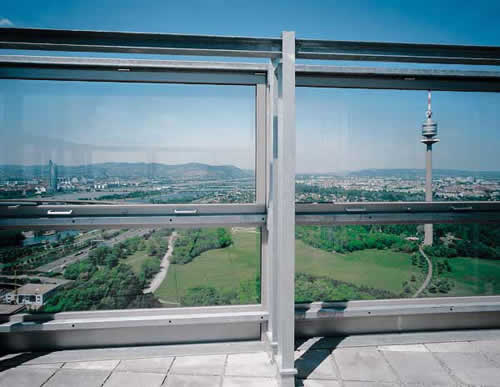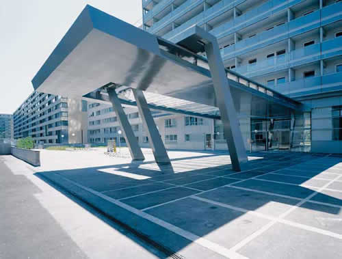240 Wohnungen - die Menge wird von der einheitlichen Fassadengestaltung beruhigend kaschiert. „Gerade im sozialen Wohnbau, wo sich jede Wohnung an der Fassade abzeichnet“, so die Architekten, „muss man sich einer zusammenfassenden Struktur bedienen, um dieses heterogene Bild vieler Wohneinheiten in einer einzelnen Einheit zu beruhigen.“ Die Loggien-Fassaden sind an der äußersten Schicht vollständig verglast, nur vereinzelte Aussparungen fangen Bilder aus der Landschaft und rahmen sie ein. Im Siebdruckverfahren - ein Steckenpferd von Delugan Meissl - sind die Glastafeln in eine Matrix aus vertikalen weißen Streifen eingehüllt. In den unteren Geschoßen dichter, oben, wo die Konkurrenz der neugierigen Einblicke schon deutlich abgenommen hat, hat der Raster mehr Durchlässigkeit zugelassen.