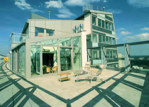 Außergewöhnlicher schließlich die breite Fassade Richtung Stadt. Die homogene Haut aus schwarz durchgefärbtem Eternit ist durch vereinzelte französische Fenster perforiert. Damit nicht der Eindruck von Glaslisenen entsteht, die die Fassade vertikal aufschlitzen, wurden die Maueröffnungen, dem Zufallsprinzip folgend, versetzt angeordnet. Solange sich die grafische Maßnahme nicht negativ auf den Innenraum auswirkt, sondern im besten Falle positiv (im schlechtesten indifferent), ist ein Layout-Denken legitim: „Grafik spielt selbstverständlich eine essentielle Rolle“, so Projektleiter Christopher Schweiger, „es wäre total falsch, nicht grafisch zu arbeiten, solange diese Arbeitsweise nicht ausschließlich ist.“ Nun fragt man sich, welche Funktion die weiß auskragenden Schilde haben, die so vereinzelt - noch lapidarer als die Fenster - über die große Fassadenfläche verstreut sind. Sonnenschutz etwa, rein grafische Spielerei oder gar brüstungslose Balkone für den Freitod aus der Höhe? In einem früheren Projektstadium haben die Schilde noch den Brandüberschlag verhindert. Baupolizeilich vorgeschrieben, architektonisch mit poetischer Leichtigkeit eingelöst. Mittlerweile hat Mischek den Brandschutz anderweitig - billiger - in den Griff bekommen, die heutigen Stahlelemente sind ein leises Zitat dessen, wie schön selbst behördliche und technische Parameter eine Fassade einst determinieren konnten.