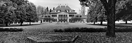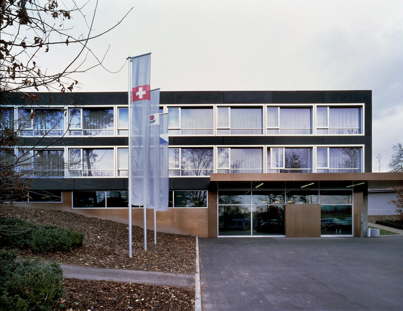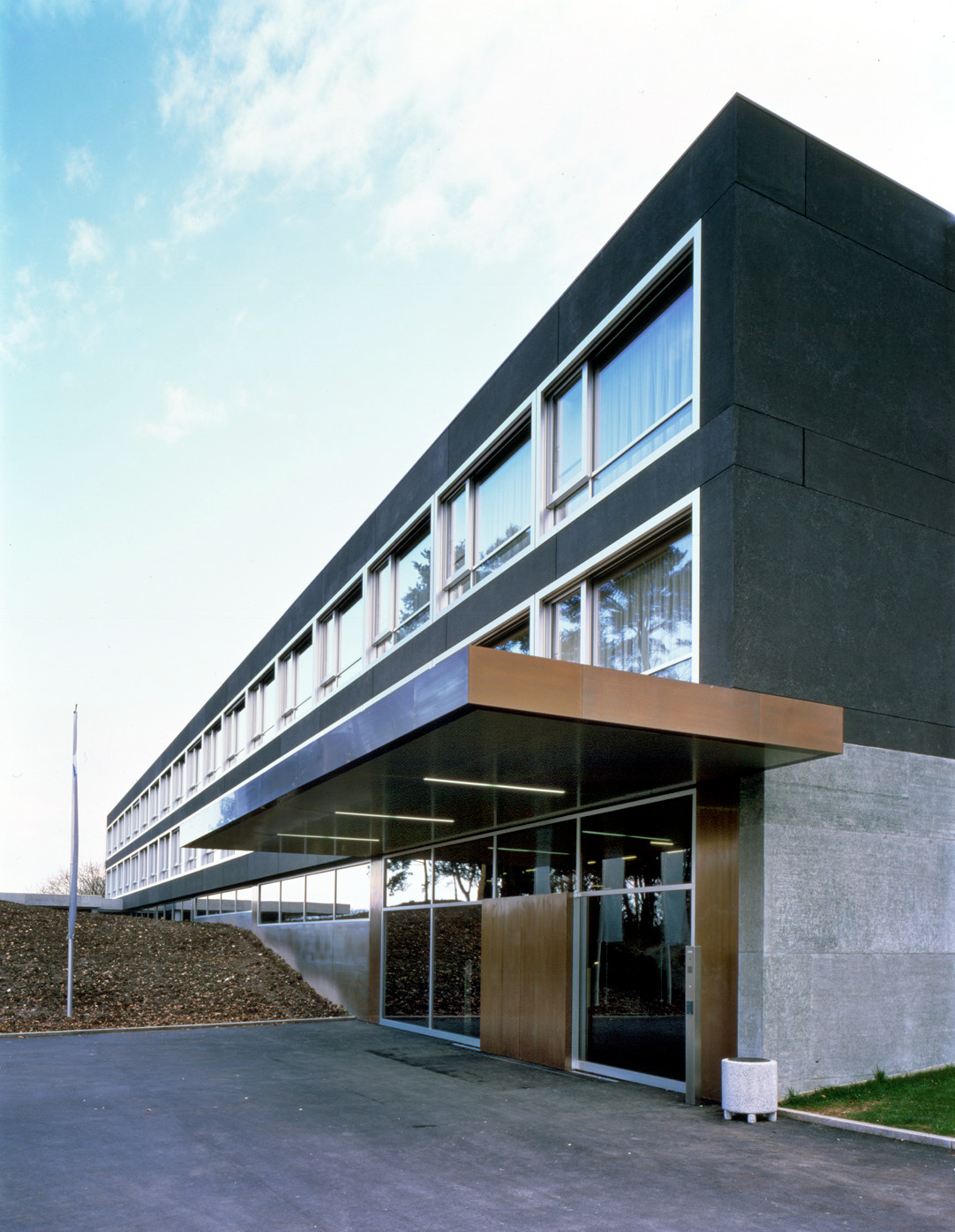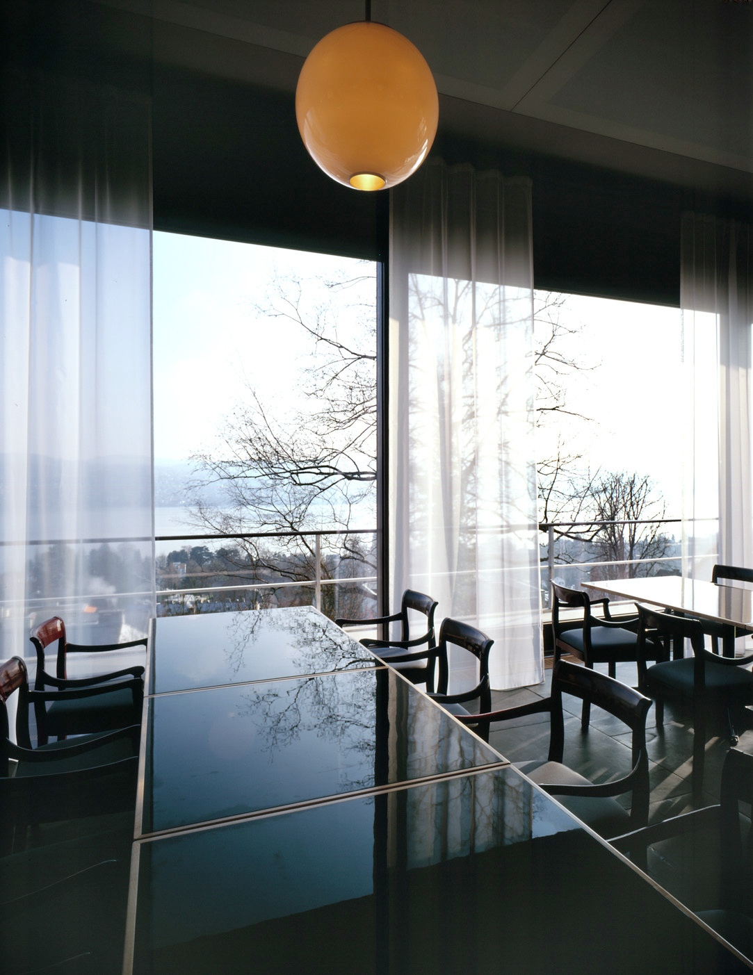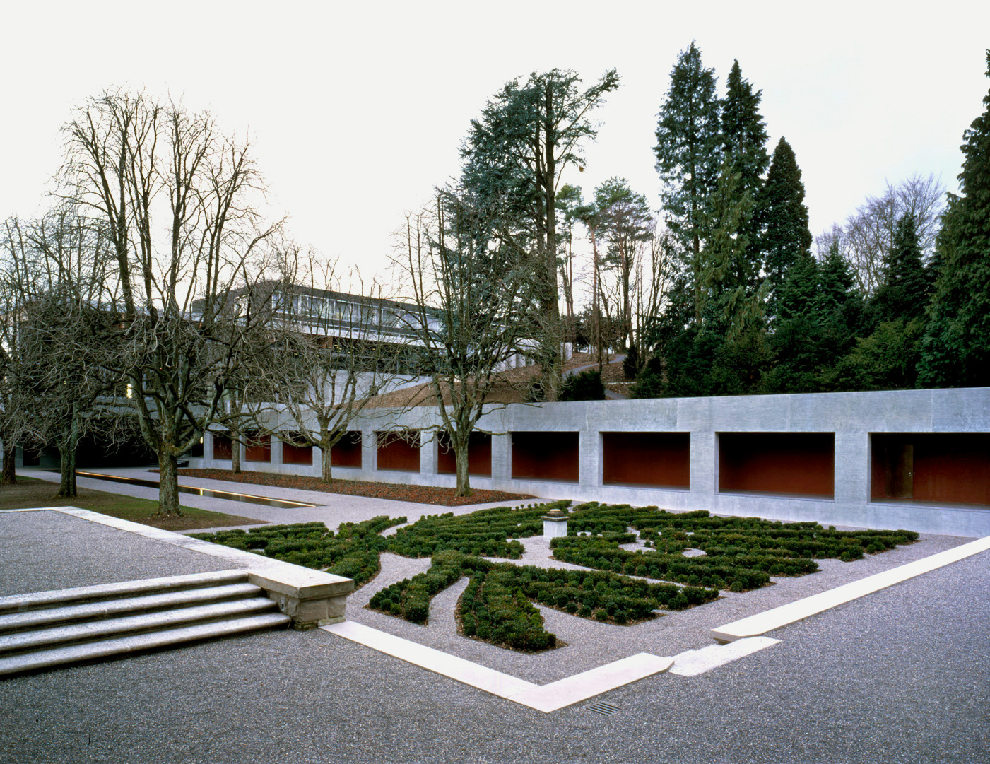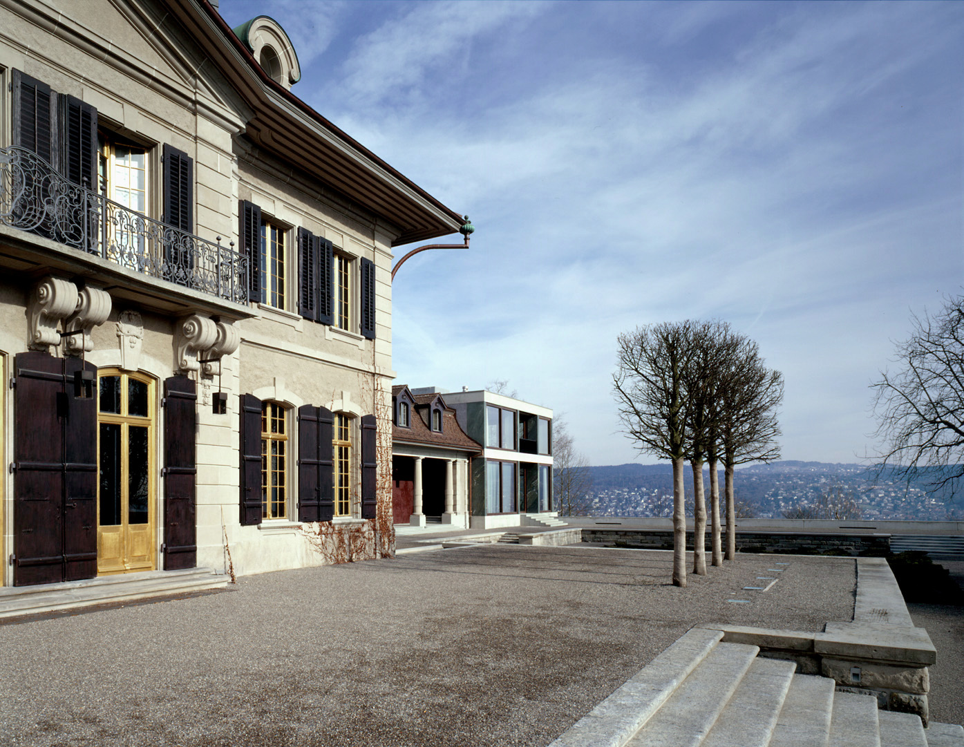 Wer heute das neue Centre for Global Dialogue der Swiss Re aufsucht, fährt an der Allee zum ehemaligen Bodmergut eher achtlos vorüber und verlässt die Strasse erst da, wo kleine Baumgruppen und formgeschnittene Hecken die Vorfahrt zum eleganten Seminargebäude der Architekten Meili & Peter markieren. Es könnte in seiner stilistischen Zurückhaltung kaum in grösserem Kontrast zur nahe gelegenen Villa stehen, welche die Architekten Richard von Sinner und Hans Beyeler 1926/27 historisierend im Stil bernischer Landschlösser des 18. Jahrhunderts errichteten.