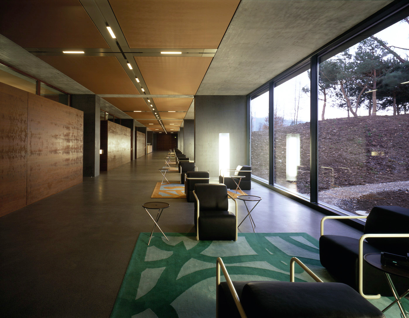 Das idyllisch zwischen Kastienbäumen am See gelegene Seminarzentrum der Architekten Meili&Peter öffnet sich seiner ansprechenden Umgebung durch großzügige Glasflächen. Der hohe Foyerbereich, in zwei Bereich gegliedert, wird von einem Dach, das 13 m auskragt, überdeckt. Im unteren Foyer und dem anschließenden Forum tragen große Balken aus Holz-Leimbindern die Decke und ermöglichen die stützenfreie Glaswände nach außen. Geteilt und statisch getragen, werden diese zwei repräsentablen Räume durch eine Betonwand, auf der die vorgespannten Balken aufliegen. Die Profile der Verglasung spannen die Konstruktion nach unten und fungieren als Zugbänder im Foyer. Beim anschließenden Forum spannen runde Stahlstützen die Balken ab - können dort aber auch Zugkräfte aufnehmen.