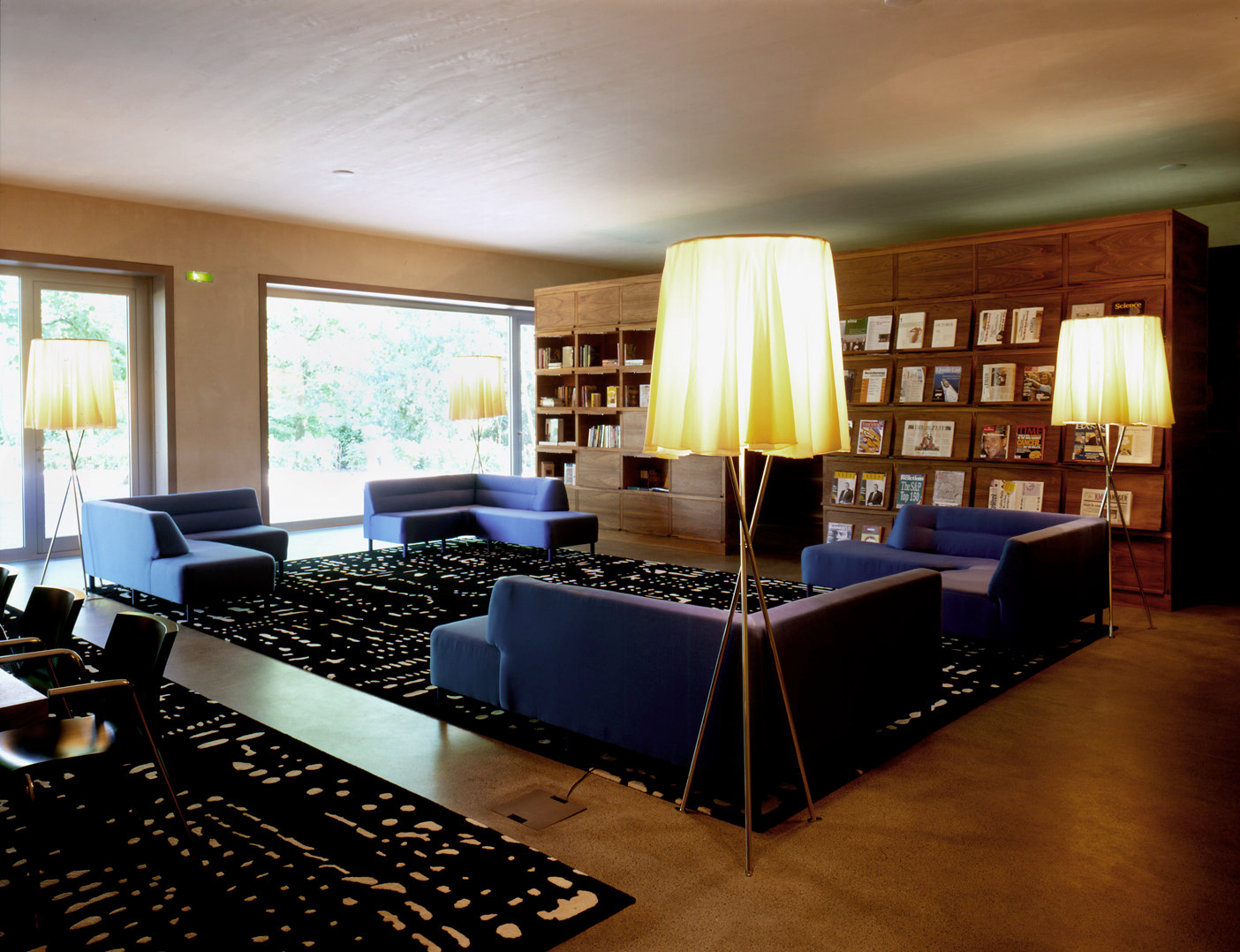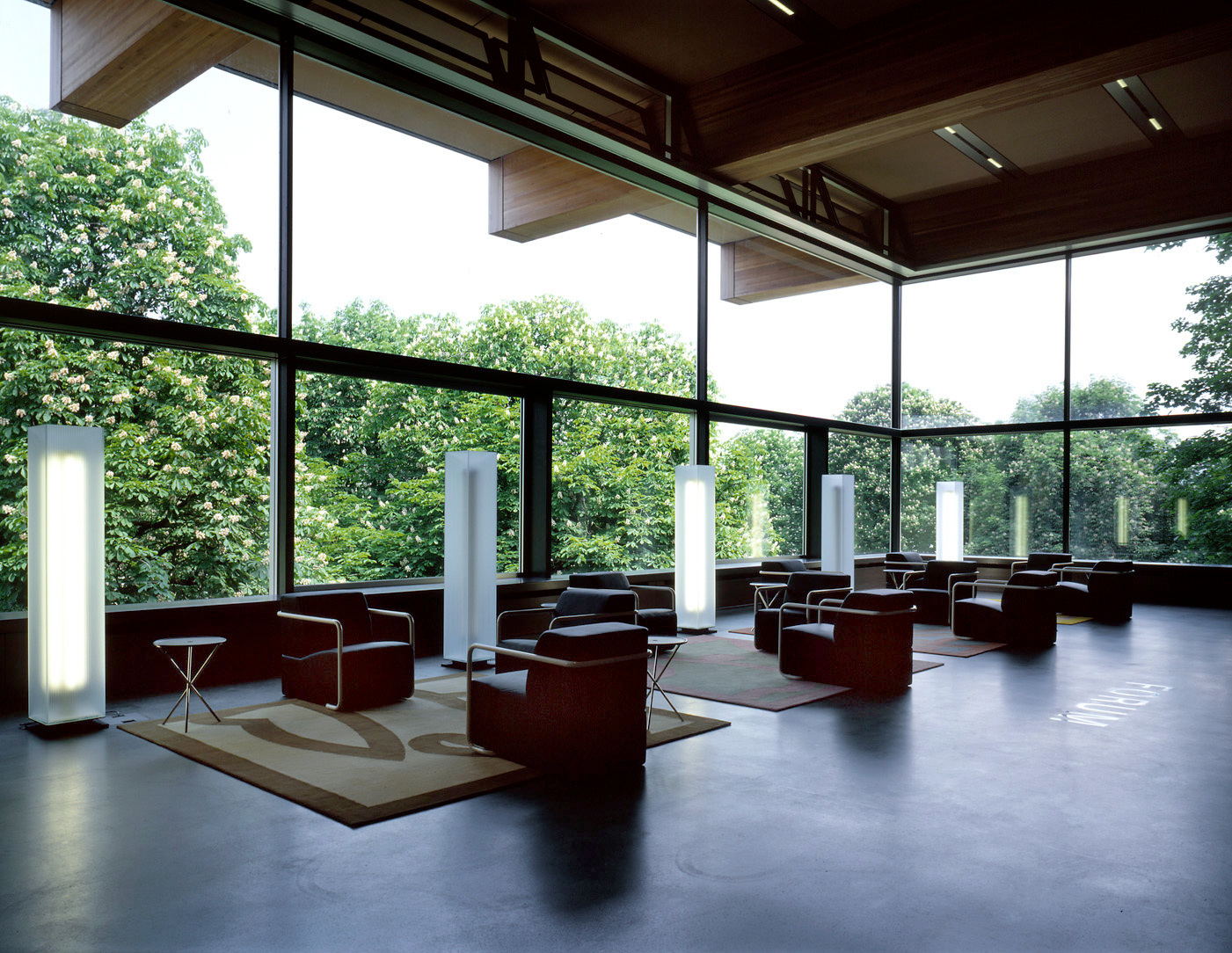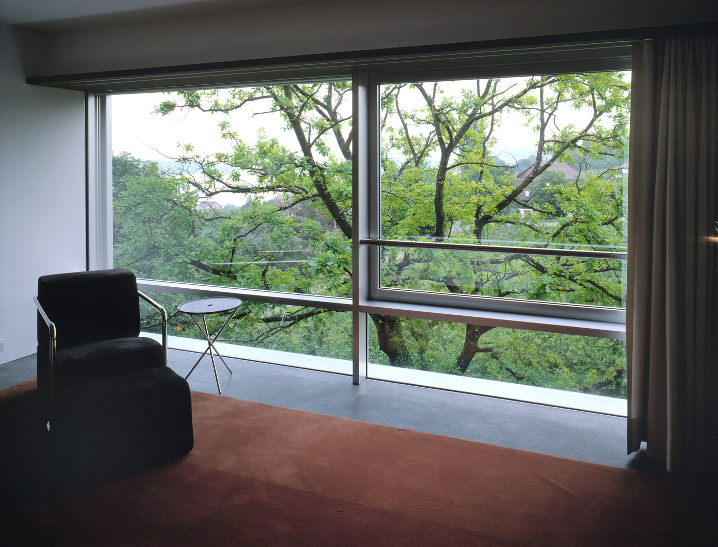 Vom grossen Seminarraum im weit auskragenden Obergeschoss geniesst man den Blick in die Baumkronen und auf die Rasenfläche, die im Frühling von vierhunderttausend Krokussen in einen farbenfrohen Blütenteppich verwandelt werden soll. Eine willkommene Abwechslung inmitten der monochromen Inszenierung aus fein abgestuften Grüntönen und unterschiedlichen Blatttexturen.
