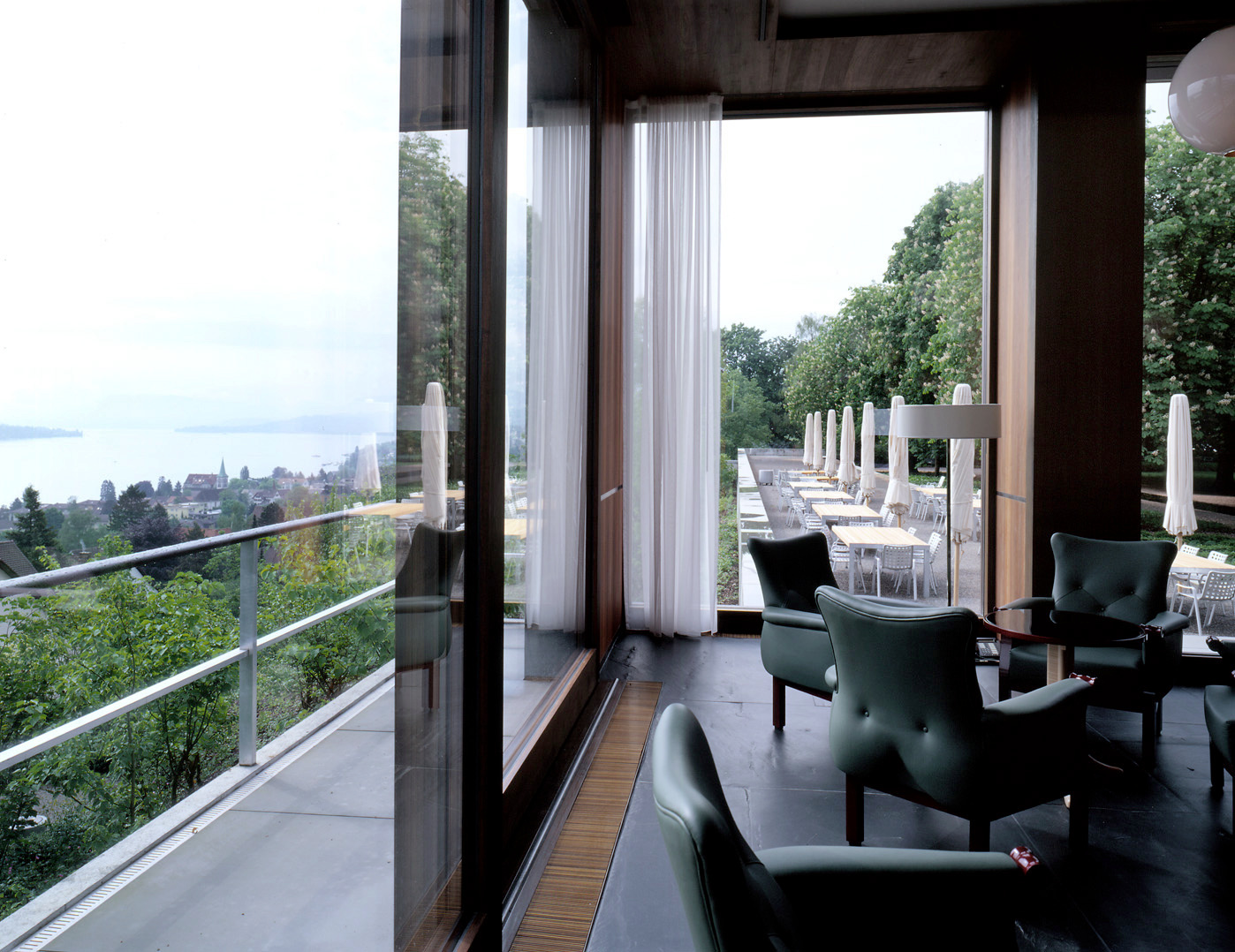 Weiters war mit Holz der thermische Übergang beim Vordach viel einfacher und eleganter lösbar und konnten die Balkenuntersichten im Saal akustisch und optisch pur in dem dort noch anspruchsvolleren Raumcharakter mitspielen. Und schließlich: Veranden zum Garten sind im kollektiven Gedächtnis immer noch als Holzvorbauten mit großen Glasfenstern abgespeichert. Meili&Peter rühren vielleicht an diese Erinnerung. Der Typus ist jedoch vollkommen neu dargestellt und unsentimental in die Wirkung modernster Holzbautechnologie übergeführt, wo flächige Schichtungen, Vorfertigung enormer Teile und statische Ausreizung mit Vorspannung und dergleichen eine ganz neue Grammatik des Materials und seiner Ausstrahlung erzeugen.