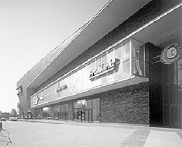 An der Magistrale: der bauchige Teil des Gebäudes. Ein Schiffsbauch? Jedenfalls bildet er eine überaus markante Ecke und ist gläsern aufgeschnitten, sodaß man den Menschenstrom zu den Kinos sieht. Architekten ist es heute ja leider untersagt, in die Kino-Architektur einzugreifen. Die wird von den Großkonzernen bestimmt (siehe auch Coop Himmelb(l)au in Dresden). Aber wenigstens bildet sich in einem der großen Säle die Gegenform des Gebäudebauchs ab. Schon das ist schön. - Und dann die lange stadtseitig orientierte Gebäudefront. Der Backstein schimmert da je nach Sonnenlicht-Einfall dunkelviolett bis hellrot - wirklich toll. Und da kommt auch noch der Faktor Intelligenz dazu. Denn Hubert Hermann hat natürlich genau gewußt, was ihm an dieser Fassade an Werbeflächen-Anforderungen bevorsteht. Er hat vorausschauend reagiert. Mit Vordächern, die gewissermaßen multifunktional sind. Sie erlauben den „trockenen“ Gang entlang des Gebäudes auch bei Schlechtwetter, ihre Streckmetall-Verkleidung bildet gleichzeitig die Hintergrundfolie für die Werbung. Die wird also zu einem heterogenen, wie auch immer illuminierten Band des Kommerzes. Soll sein.