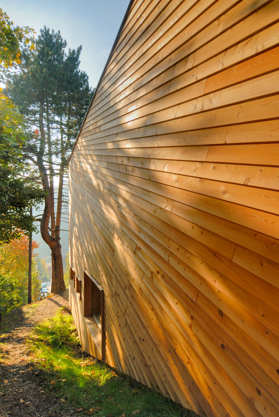 Dem in den Hang integrierten unteren Geschoß ist ein kleiner dimensioniertes Obergeschoß draufgesetzt. Mit seiner Fassadenverkleidung aus unbehandelten Lärchenholzpaneelen kann die aufgesetzte Schachtel durchaus als Zitat der vormals hier plazierten Scheune verstanden werden.