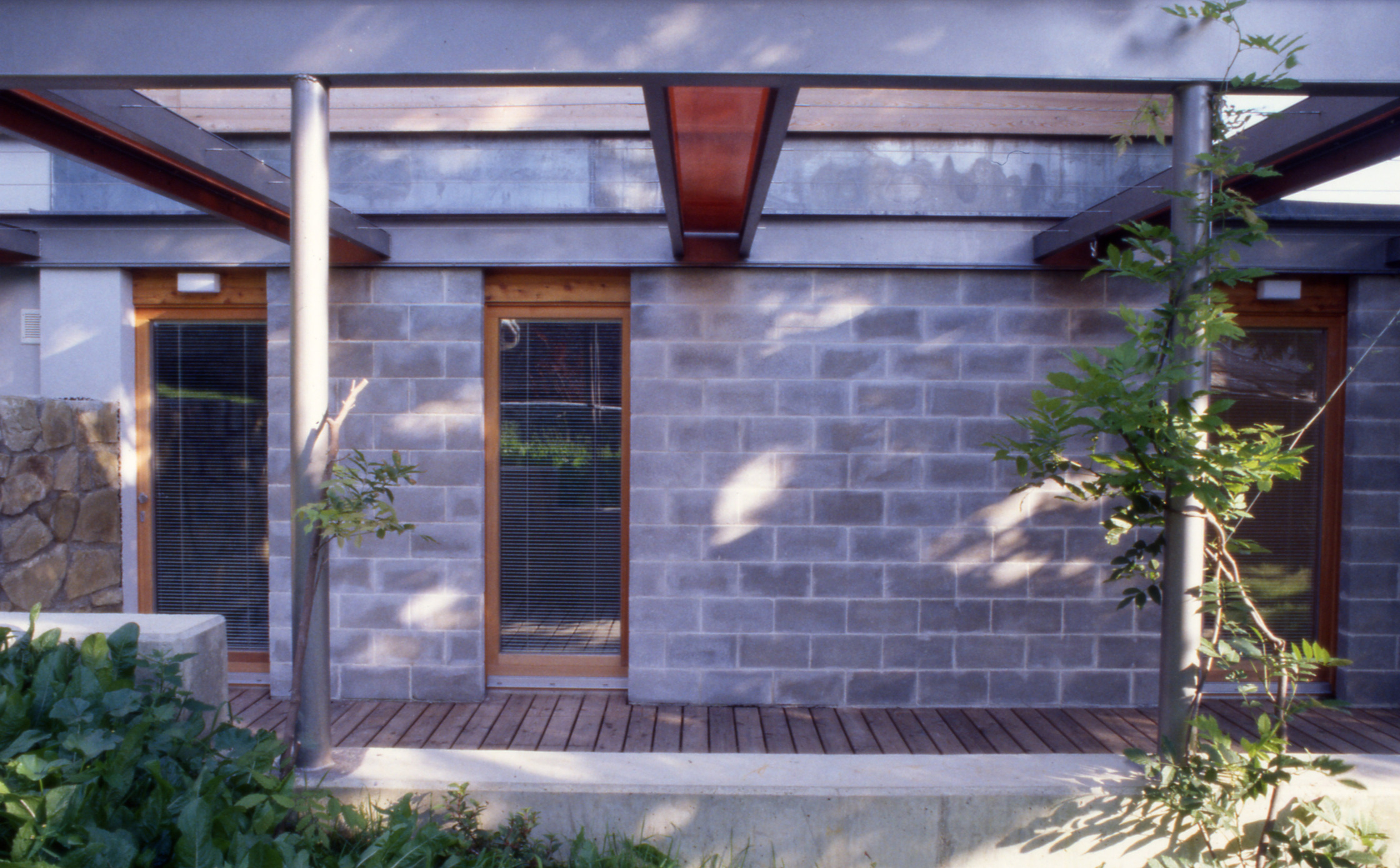Konterkariert wird diese konstruktive Linearität einerseits von zwei Geländestützmauern aus Natursteinen, die vom abgebrochenen Hofgebäude stammen und einem Baum, der, in der Westecke des Innenhofes stehend, konzeptionell so eingebunden wurde, daß er in der warmen Jahreszeit als Schattenspender für die intime, mit Lärchenholz belegte Terrasse an der Breitseite des Hauses zum Tragen kommt.