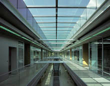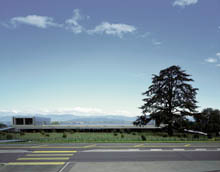 Von der Halle geht es hinunter ins Empfangsfoyer, ins Restaurant, ins Auditorium und in den Garten - oder über eine der vier Treppen hinauf in die obere Büroetage, die durch gläserne Laubengänge erschlossen wird. Seitlich angeordnete Stiegenhäuser gewähren Zugang zu den Glaspavillons auf dem Flachdach. Dieses Belvedere, von dem ein atemberaubender Panoramablick auf Alpen, See und Jura geht, verkörpert zusammen mit dem von hier aus über zwei zierliche Brücken erreichbaren Zedernparterre eine höchst zeitgemässe, von allen Schlacken der Geschichte gereinigte Neuinterpretation der klassischen französischen Gartenarchitektur.