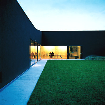 Zum Hof hin offen über großflächige Schiebefenster, zur Straße hin bis auf eine quadratische Verglasung nächst dem Eingang uneinsehbar und – das schreckte selbsternannte Ortsbildhüter wohl am meisten – rundum schwarz verputzt. Diese kompromisslose Reduziertheit unterscheidet sich von der bis heute in der landauf, landab in der neuen Weinarchitektur gepflegten Geschwätzigkeit mit ihren Zitaten und Anspielungen – sei es an feudale Architektur der französischen Chateaus oder in Form von vermeintlich weinbauspezifischen Materialien wie grünem Glas, Flaschen, Kork, Naturstein, Eichenholz oder was marketingbeflissenen Menschen sonst einfällt. Burghardt und Loimer haben sich nicht dazu verleiten lassen, Funktion und Inhalt zu überhöhen und als Ausdruck des im Zuge des Weinbooms erstarkten Selbstbewusstseins der jungen Winzerszene eine dekorierte Hütte zu bauen. Vor wenigen Jahren noch der letzte Schrei, sehen manche davon nämlich schon wieder ziemlich alt aus.