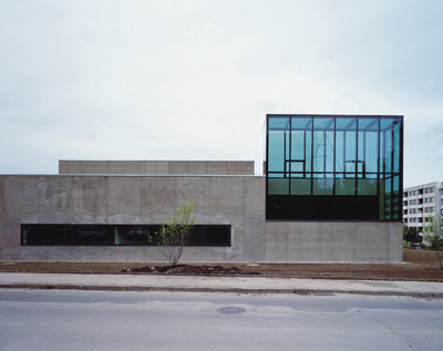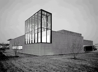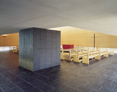 Der Bau ist als Kirchenbau in vielfacher Hinsicht ungewöhnlich. In seiner Abstraktion schafft er eine neue Symbolik, sogar der Glockenturm wurde durch einen schmalen Glaskubus ersetzt, der die durchgehende Horizontalität konterkariert. Auch das dialektische Spiel von Geschlossenheit und Öffnung zur Umgebung ist durchaus unüblich. Die Architekten wollten «Spannungsfelder entwickeln» und die Hermetik mit «forcierter Offenheit konfrontieren». So blickt man beim Eingang durch eine profillose Glaswand in die Vorhalle und weiter durch eine zweite gläserne Trennung ins Atrium und bis zum Taufbereich. Beim diagonal gegenüberliegenden Wasserbecken ist diese Immaterialität der Wand noch grosszügiger. Von aussen sieht man unmittelbar in den Kirchenraum, ist dabei jedoch durch die Wiese auf Distanz gehalten. Die Simultaneität verschiedener räumlicher Zonen ist bereits hier offensichtlich und findet im Inneren ihre logische Fortsetzung. In der Wochentagskapelle bemerkt man folglich nicht nur die seitliche Raumweitung nach oben in den Glaskubus, man blickt zudem über den Taufstein auf das Wasserbecken und die Siedlung im Hintergrund beziehungsweise - jetzt in diagonaler Richtung - zum niederen Weg und zum hohen Hauptraum dahinter.