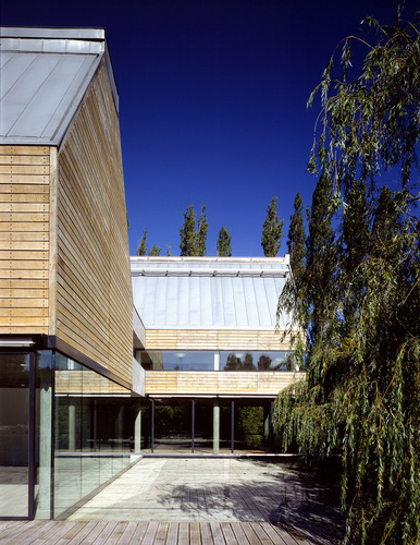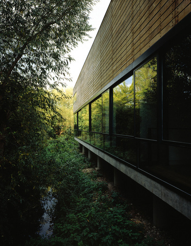 Das Museum, das aus zwei parallel angeordneten, über eine Passerelle mit einem Annexbau verbundenen Ausstellungstrakten besteht, antwortet auf die natürlichen Gegebenheiten der am Rande des historischen Städtchens Henley sich ausbreitenden Flussauen, indem es sich - ähnlich wie Glenn Murcutts australische Verandahäuser - auf Pfeilern über das Marschland erhebt. Es beschwört so die Idee der Urhütte und verweist auf Pfahlbauten, kann aber auch als metaphorische Anspielung auf die hier im Sommer üblichen Regatta-Zelte gelesen werden. Dennoch kommt es ganz ohne historisierende Zitate aus: anders als Terry Farrells postmodernes Meisterwerk, das etwas flussabwärts im Herzen von Henley gelegene, aber auf die alten Landsitze am Fluss Bezug nehmende Regatta-Hauptquartier von 1985.