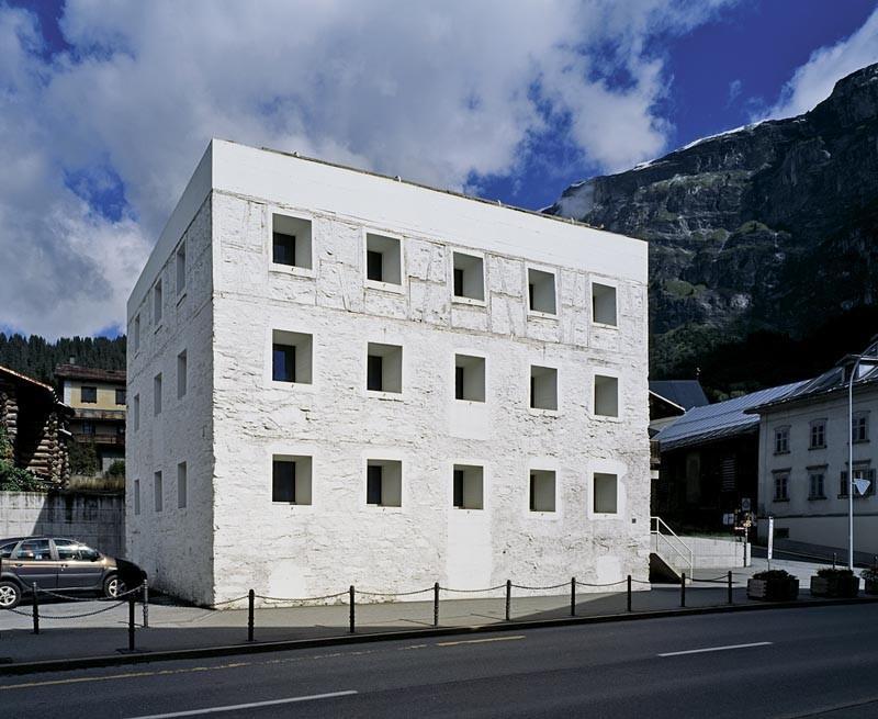 Wer sich an das lange verwahrloste Wohn- und Geschäftshaus erinnert, wird seinen Augen kaum trauen: Wie eine Fata Morgana steht ein beinahe unwirklich weisses Gebilde an der Hauptstrasse, als habe es sich aus dem Reich der reinen Geometrie und der reinen Farbe in die unvollkommene Welt verirrt. Die Folie der alten Strickbau-Scheunen im Hintergrund und die gesichtslosen Tourismusbauten der sechziger und siebziger Jahre ringsum lassen den Kontrast noch deutlicher hervortreten. Aus der Nähe betrachtet, wird die Idee zur Erscheinung, schimmert hinter dem zeitlosen Sein das historisch Gewordene hervor. Denn einem Palimpsest gleich ist hinter den mit weisser Mineralfarbe gestrichenen, unverputzten Fassaden die Struktur des vorhandenen Baus erkennbar: Natursteinmauer in den unteren Geschossen, eine Riegelkonstruktion in der obersten Ebene.