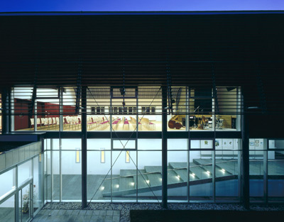 Blick in den Konzertsaal und auf die große Treppe bei Nacht