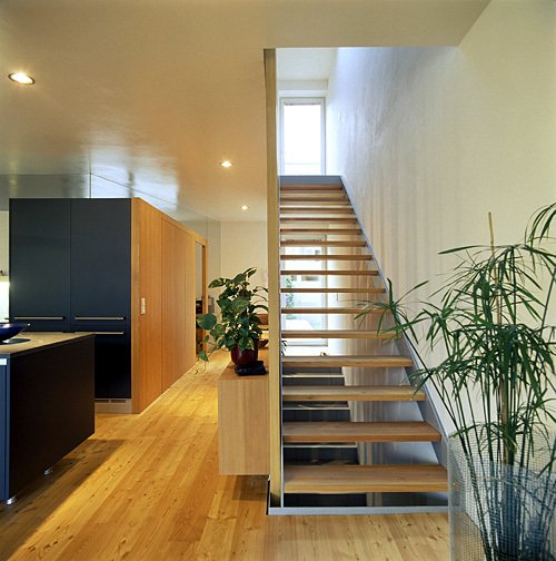 „Es ist alles bis ins kleinste Detail durchdacht, darüber sind wir sehr glücklich“, sagt Annemarie Eder. Sie war eine der ersten Interessentinnen für die neuen Wohnungen. Das Projekt gefiel ihr so gut, dass sie den Innenraum vom Architekten gleich mitplanen ließ. Jungmann arbeitete mit dem Licht: Wie durch ein Prisma fällt es vom Himmel durch die Lärchenstufen in den Vorraum, der schließlich mit grauem Eternit verkleidet ist.