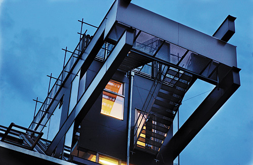 Kühn ragen die expressiv vorgezogenen, brandschutzbedingt überdimensionierten, gipsfaserplattenverkleideten, dunkelbraunen Deckenträger in den Hof, dazwischen schwebt ein breiter Querbalken. Er bildet das leseund rauchpausenfreundliche Aussichtspodestplateau der eingehängten Metallstiege, auf der man mit Freiblick in schwindelnder Höhe die Terrasse erklimmt, die sich über den First hinweg als gemeinsames urbanes Sonnendeck und Partyplateau zur Straße im Süden vorzieht.