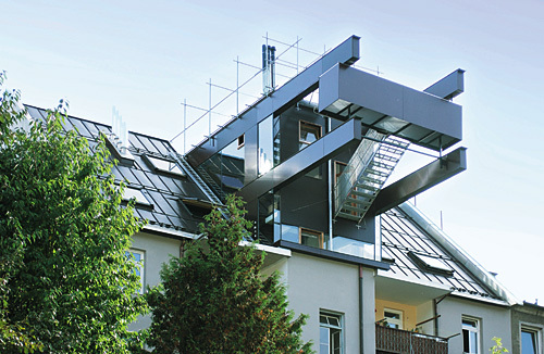 Pichler ein vorgefertigtes Holzsatteldach mit dezenten Flächenfenstern auf ein altes Innsbrucker Haus, kühn setzten sie ein Stück Stiegenhaus an die frische Luft. Sie schenkten damit dem Innenhof eine expressive Skulptur, den Bewohnern eine gemeinsame Terrasse überm First und der obersten Wohnung die ganze Hauslänge.