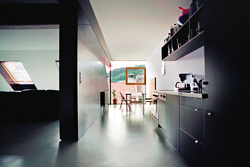 Am stadtseitigen Blockrand übt sich die spektakuläre Mitte mit zwei zurückspringenden, dreiseitig verglasten Gaupen in vornehmer Zurückhaltung. Spielerisch setzen zwei öffenbare Fensterrahmen am Regenrohr die Altbausymmetrie fort. Seiner Logik folgen auch die gespiegelten Grundrisse der ersten Dachebene an der verlängerten Stiege. Die Toilette findet im treppenflankierenden Zwischenraum vorm ersten Sparren Platz, durch ihre schräge Außenglaswand blickt man in die Tiefe. Vom Eingang bis zum lichten Südblick erstreckt sich ein langer Raum mit Küchenblock an der Trennwandmitte, unter den schrägen Dachfenstern zwischen den Sparren lebt man auf großem Fuß im nord-süd-himmelshellen Einraum oder schafft mit Zwischenwänden mehrere Zimmer. Alle Tragkonstruktionen sind mit dunkelbraun befilmten Sperrholzplatten verkleidet, die auch Kabel und Rohre bergen. Kästen, Schiebetüren, Küchen- und Sanitärboxen sind aus demselben Material, was schön mit dem hellen Estrich, Decken und Wänden kontrastiert und dem Inneren einen vornehm einheitlich ruhigen Charakter gibt. Der wahre Luxus liegt unterm First, wo sich die oberste Wohnung ungeteilt über die ganze Länge erstreckt. Ebenso edel hell-dunkel gestaltet, öffnet sich hier die zurückgesetzte Gaupe mit Glastüren zur Südterrasse, von der man über angepflanzten Wein und Zaha Hadids Schanze hinweg bis zum Patscherkofel blickt.