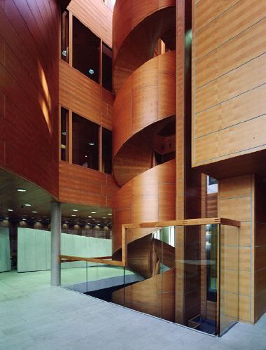 Die Gestaltungshoheit für die Häuser lag bei den einzelnen Ländern, die für Architektur und Innenausstattung Vertreter aus der Heimat beauftragten. Botschaften sind auch Visitenkarten eines Landes, und so hat sich der nach innen gestülpte Fassadenreigen zum spannungsgeladenen Beauty Contest aufgeschwungen. Man durchläuft hier einen Themenpark, der die Kunst der Variation von Material und Form bestechend zur Anschauung bringt. Die Lamelle dient als Leitmotiv und sorgt in vertikaler Gliederung für die Einheit in der Vielfalt: bei den Dänen (Nielsen, Nielsen & Nielsen, Århus) erscheint sie in Gestalt von gelochten, aufklappbaren Edelstahlplatten; der in die Ecke gekuschelte isländische Kubus (Architekt Pálmar Kristmundsson, Reykjavik) leuchtet in rötlichem Ryolith mit Lavaeinschlüssen; die Norweger (Snøhetta, Oslo) übernehmen die Konstruktion des Kupferbandes in der gläsernen Kühle einer Eislandschaft; das junge finnische Team ( VIIVA Arkkitehtuuri, Helsinki) hängt vor die Glasfassade ein Gitterwerk aus Lärchenholz, das den Minimalismus des Gebäudes skulptural überhöht; am Schwedenbau (Wingårdh Arkitektkontor, Göteborg) wechseln Reihen aus Glas mit grob abgeschlagenen Quarzitplatten, was in der Theatralik direkt auf das Interieur verweist, wo sich im Foyer kunstvolle Schreinerarbeit mit künstlich orange gebeiztem Birkenholz beisst.