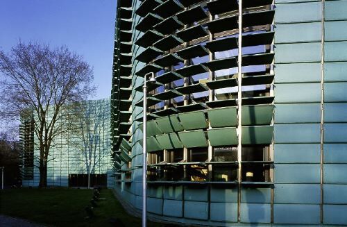 Schon längere Zeit ragte am südlichen Rand des Tiergartens die fünfzehn Meter hohe Lamellenwand auf. Dahinter, so hörte man, entstünden die Botschaften der nordischen Länder. Aber nichts war zu sehen: kein Haus, das allmählich in die Höhe wuchs, während Berge von Baumaterial rundherum schrumpften. Die Konstruktion ruhte wie ein Reptil mitten im Betrieb um das verkehrsreiche Klingelhöfer Dreieck und zeigte neugierigen Blicken die kalte Schulter. Irgendwann sträubte sich dem grossen Tier der Nacken, und es fing an zu leuchten, als hätte jemand beim Adventskalender verbotenerweise schon einzelne Fenster aufgeklappt. Als endlich alles fertig war und ausnahmsweise zur Besichtigung offenstand, präsentierte sich, was normalerweise verborgen bleibt: ein diplomatischer Gemeinschaftsauftritt, angelegt als architektonisches Gesamtkunstwerk auf 7200 Quadratmetern mit fünf solitären Gebäuden und einem öffentlichen Zentrum, zusammengehalten nach drei Seiten von einem geschwungenen, grün patinierten Kupferband.