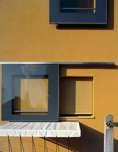 Wo die Einfahrtsschneise der Mühlkreisautobahn im Osten das Linzer Stadtgebiet klar von der Industriezeile am Hafen trennt, liegt eine schmucke Arbeitersiedlung der Nachkriegszeit. Einfache, zweigeschoßige Häuser mit steilen Dächern und Gärten reihen sich hier aneinander.Mit der Zeit verpassten ihnen die Nutzer mit frischen Anstrichen, Dachgaupen und Vorbauten einen neuen Stil, was der homogenen baulichen Grundstruktur einen patchworkartigen Charakter gibt. Hier teilen sich die Bauherrn die Nordhälfte eines Doppelhauses mit dem Cousin zu ebener Erde und der Tante im ausgebauten Dachgeschoß. Ca. 9,5 m im Quadrat bilden je ein Haus, der Grundriss gehorcht der kargen Ökonomie der Nachkriegszeit: Eine Holztreppe im NO-Eck, ein knapper Flur, ein kleines Fenster belichtet je zwei Räume in West und Ost, nordseitig reihen sich WC, Bad und eine 3 m²-Miniküche aneinander. Das Haus liegt auf ca. 20 m breitem, fast 40 m tiefem Grund, an der Schmalseite im Westen ist die Straße, im Norden der Eingang, es musste saniert werden.