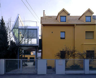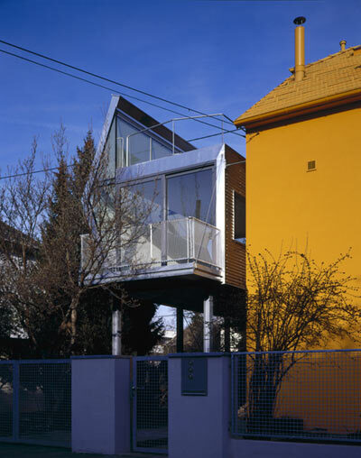 Abstrakt verfremdet nimmt der Bauköper den ortsprägenden Haustyp auf. Seine Urform wurde wie eine Schachtel aufgeklappt, sodass sich das �Satteldach� zur Sonne öffnet. Es wirkt wie eine Parabolantenne als Lichtfänger, der Sonnenstrahlen über eine Glasfläche am Dach in den Raum lenkt. Von oben uneinsehbar, fallen sie durch den Luftraum zwischen den Stahlskelettträgern ins Innere, wo sie die schräge untere Wandfläche nach oben reflektiert. Eine Neonröhre an der Deckenkante setzt das Lichtspiel nachts fort. In Ost undWest öffnet sich die Zubaufaltung mit raumhohem Glas und Schiebetür zu zwei Balkonen, zarteMetallsteher mit rudimentären Netzen bilden das Geländer, man blickt durchs Blätterdach der schönen Magnolie an der Straße über die Siedlung. Am Dach hat die Tante auf einer Ebene mit ihrer Wohnung eine Terrasse mit weitem Linzpanorama.
