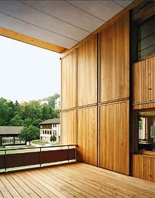 Die Außenfassaden bestehen aus auf die Konstruktion angeschlagenen Platten aus unbehandelter Eiche. Alle äußeren Wände der Schulräume sind wegen der Scheibenwirkung in der Lage, als kontinuierliche Auflager der Deckenelemente zu dienen. Dies ermöglicht es auch, die Decken der Balkonräume direkt von Klasse zu Klasse zu spannen. Die Tragrichtung verläuft dabei parallel zur Fassade, also rechtwinkelig zu der der Decken in den Klassen. Damit ist eine von stützenden Elementen freie Verbindung der inneren Erschließung mit dem Außenraum möglich, der Raum »fließt« ungehindert ins Innere des Gebäudes.