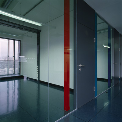 Die Biokatalyse führt es exemplarisch vor: große, robuste Räume, die verschiedene Nutzungen zulassen, weil alle Installationsleitungen offen verlegt wurden. Gänge und Stiegenhaus werden natürlich belichtet. Nebenräume für Kopierer, Kaffeeküche und WCs sind nicht hinter einem Türenwald versteckt, sondern stehen frei im Raum. Auf jeder Etage gibt es, an der Seite der Lamellenfassade, einen Balkon, wo geraucht werden kann.