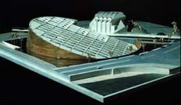 Reüssieren konnte Snohetta mit einer gleichermaßen simpel wie komplex wirkenden Großform, dem Kreis, besser gesagt, einer zylindrischen Form von 160 Metern Durchmesser. Als Antwort auf das Halbrund des Hafenbeckens, aber auch als eine dem geschichtsträchtigen Thema adäquate Form, die mannigfache Assoziationen zuläßt - etwa zum Sonnengott Ra und der orangefarbenen Scheibe in seiner Hand, zur Erforschung der Planeten und ihrer sphärischen Charakteristika, zu Begriffen wie Kontinuität und Unendlichkeit, zur Idee von Zeit. Mit einem Kunstgriff brachten die Architekten Dynamik in die an sich statische, in sich geschlossene Form: Sie kippten sie. Durch diese Bewegung hin zur Uferstraße wurde das Dach zur dominanten Fassade, das Kippen zu einem gefrorenen Moment in einer Serie von Bewegungen. Zusätzlich zum Kanon mehr oder weniger metaphorischer Bedeutungsebenen - versunkene Vergangenheit, aufragende Zukunft - erzeugt dieses Kippen einen wesentlichen städtebaulichen Effekt.