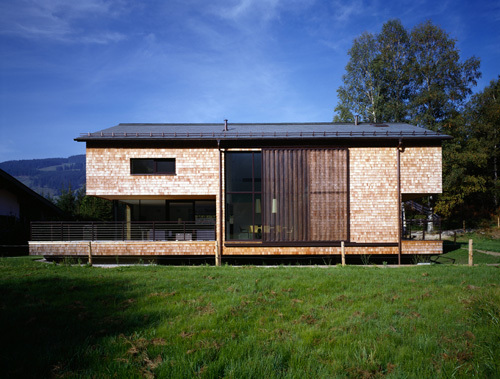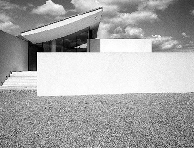 Doch: gegen Ende der Häuserzeile ein Rhythmuswechsel des Bebauten. Als Abschluss das Wochenendhaus eines Ärzteehepaares. Das Haus, es ist still. Der Architekt Johannes Baar-Baarenfels: „In diese ambivalente Situation zwischen banalem Gebauten und gekämmter Landschaft durfte nur ein sprachloses Haus gelegt werden.“ Zur Straße hin ist es nicht nur sprachlos, sondern geradezu stumm. Eine kurze Unterbrechung in der Baufluchtlinie ist eine deutliche Zäsur zum Nachbarhaus, markiert den Übergang zum Minimalistischen. Danach beginnt eine weiß verputzte Mauer. Kahl, allein drei vertikale Glaskiemen in der eigentlich fensterlos gedachten Fläche stellten sich als möglicher Kompromiss zwischen Bauherrschaft und Gemeinde heraus.