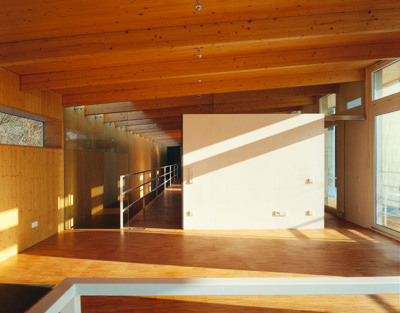 „Die Funktion muss auf die wesentlichen Dinge beschränkt sein“, so die Bauherren, „eine reduzierte Architektur wie diese war die einzig mögliche Konsequenz unserer Vorstellungen.“ Der Architekt fasst seine Methode noch präziser und spricht von „stripped to bare“. (Allein schon dem Begriff zuliebe müsste man an dieser Stelle jeden auch nur annähernd intellektuellen Diskurs über das Haus beenden.) Bis auf die nackte Haut also ausgezogen, war die Poesie des Ortes wichtiger als das Feilschen mit architektonischen und technischen Feinjustagen, die nun weder aufdringlich noch erkennbar sind. Das Pultdach beispielsweise - eine Art halbes Satteldach und mit 30 Grad die flachstmögliche Interpretation der hiesigen Baubestimmungen - ist zwar (bauphysikalisch bedingt) stolze 45 Zentimeter dick, doch wo die Auskragungen auf Wärmedämmung verzichten konnten, haben Isokörbe ihren Part übernommen und das Dach an seinen Kanten somit auf gerade einmal ein Viertel der Dicke verringert. Understatement als Planungsprämisse?