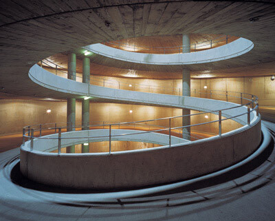 Neben diesem Garagengebäude steht aber noch ein zweites. Es ist die Ausfahrt, die sich geradezu guggenheimmäßig in die Höhe schraubt. Man kann von jeder Parkebene in diese Spirale einfahren. Aber wenn man ganz unten steht, dann bietet sie ein besonders eindrucksvolles Bild. Kein Wunder, dass Kinder ihre Eltern immer überreden wollen, möglichst weit unten zu parken, weil sie das Spektakel der Ausfahrt genießen wollen.